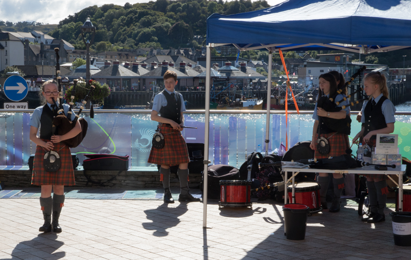 Next stop was Oban, self styled seafood capital of Scotland, where we enjoyed a seafood lunch at Ee-usk, admired the glittering jewelry at the Gem Box, and popped into the whisky distillery for a sniff of the amber nectar, all accompanied by the sound of the bagpipes being played by Oban High School pupils as part of a ‘500 minutes of playing’ fundraiser. (Fortunately, they were good!)